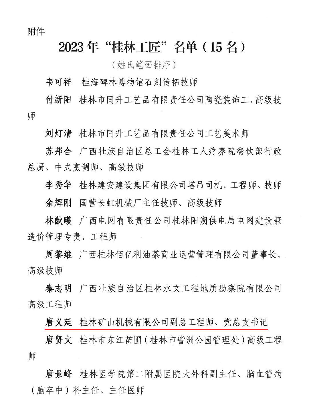 爲大(dà)力弘揚勞模(mó)精神、勞動精(jing)神、工匠精神(shen),激發廣大🈲職(zhí)工創新創造(zao)活力。近日,由(yóu)桂林市總工(gong)會、桂林☁️市工(gong)信局👄、桂林市(shì)科技局、桂林(lin)市人社局聯(lián)合開展的2023年(nián)“桂💘林工匠🔞”選(xuan)樹宣傳學習(xí)活動公布評(píng)選結果,桂林(lín)礦山機械有(yǒu)限公司唐義(yi)廷等15名同志(zhì)獲“桂林工匠(jiàng)”榮譽稱号。