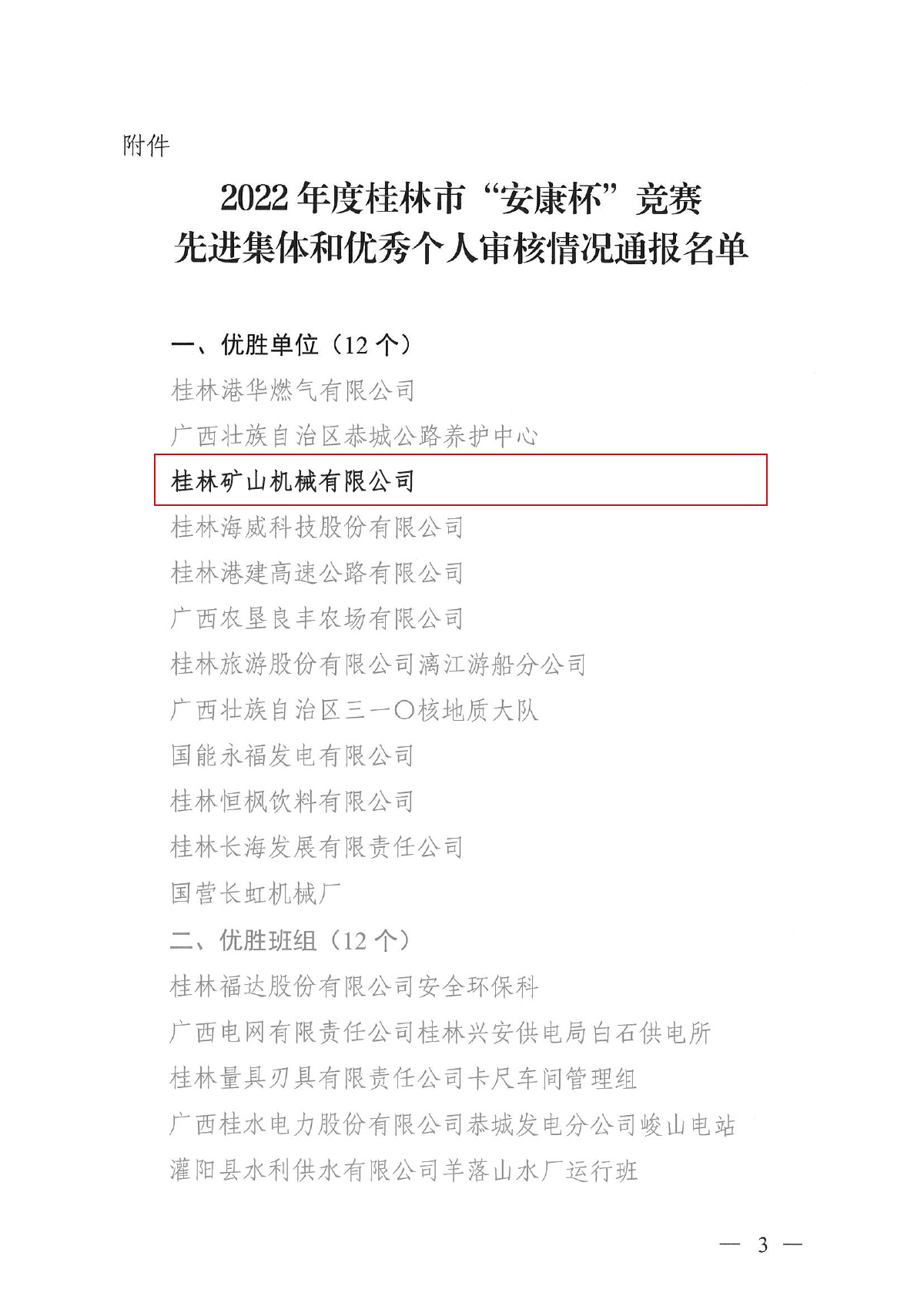 正是(shi)基于這樣的(de)努力和付出(chū),桂林礦機在(zai)“安康杯”競賽(sai)中取得了優(you)異的成績。經(jing)過桂林市總(zǒng)工會和桂林(lín)市應🌂急管理(lǐ)局的嚴格審(shěn)核和評比,桂(guì)林礦機憑借(jie)其出色的表(biao)現和❤️安全管(guǎn)理的卓越成(chéng)果,榮獲了優(you)勝單位的稱(cheng)号。